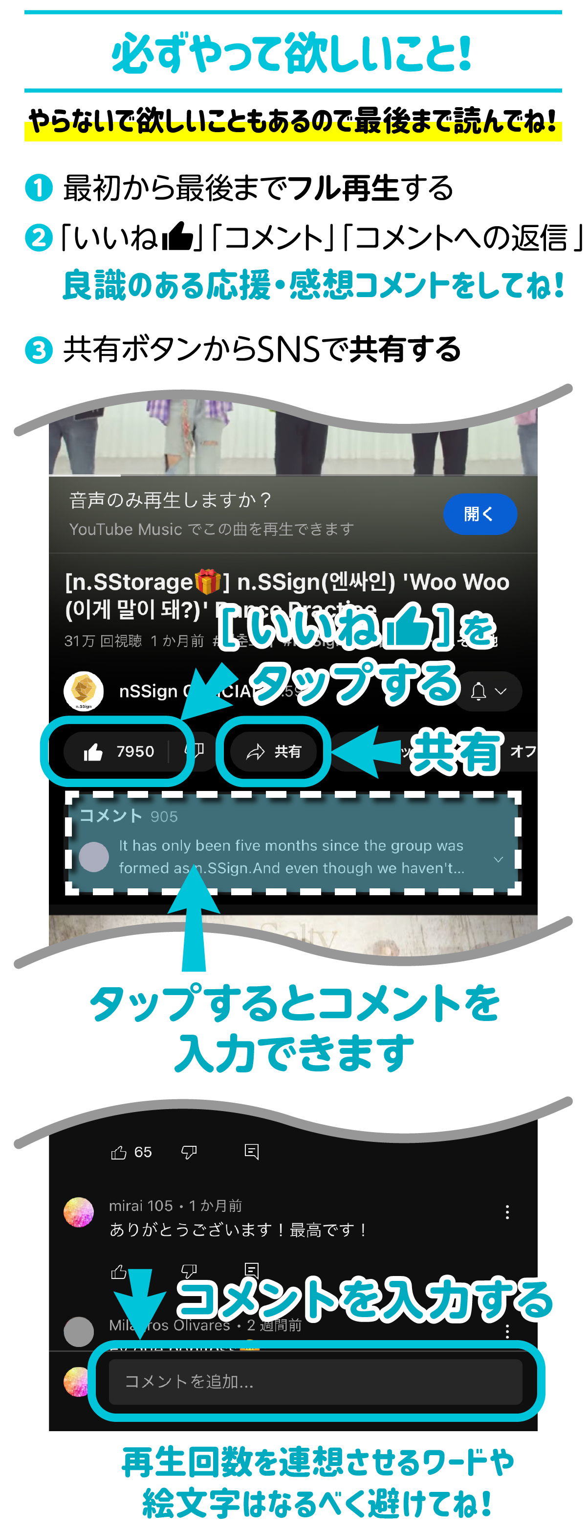 韓国では毎日のように音楽番組が放送され、そのランキングに影響及ぼすのが音源ダウンロード、CD売り上げ、投票、そしてYoutube再生回数です。それ以上にYoutubeの再生回数を上げることで、世界中にn.SSignを知ってもらえるようになります!