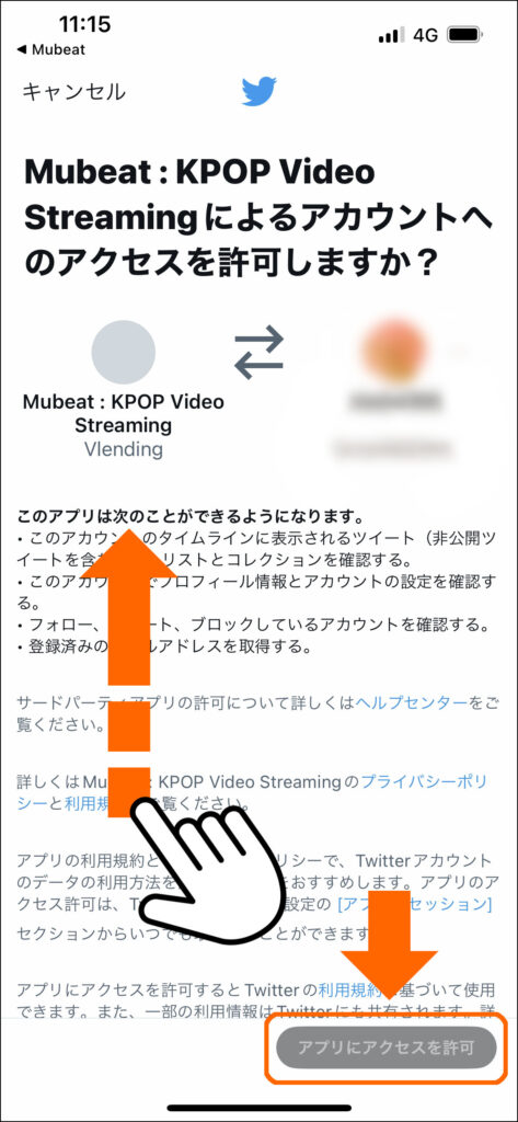 最後までスクロールさせると、右下の「アプリにアクセス許可」というボタンが、グレーから黒に変わるので、タップします。