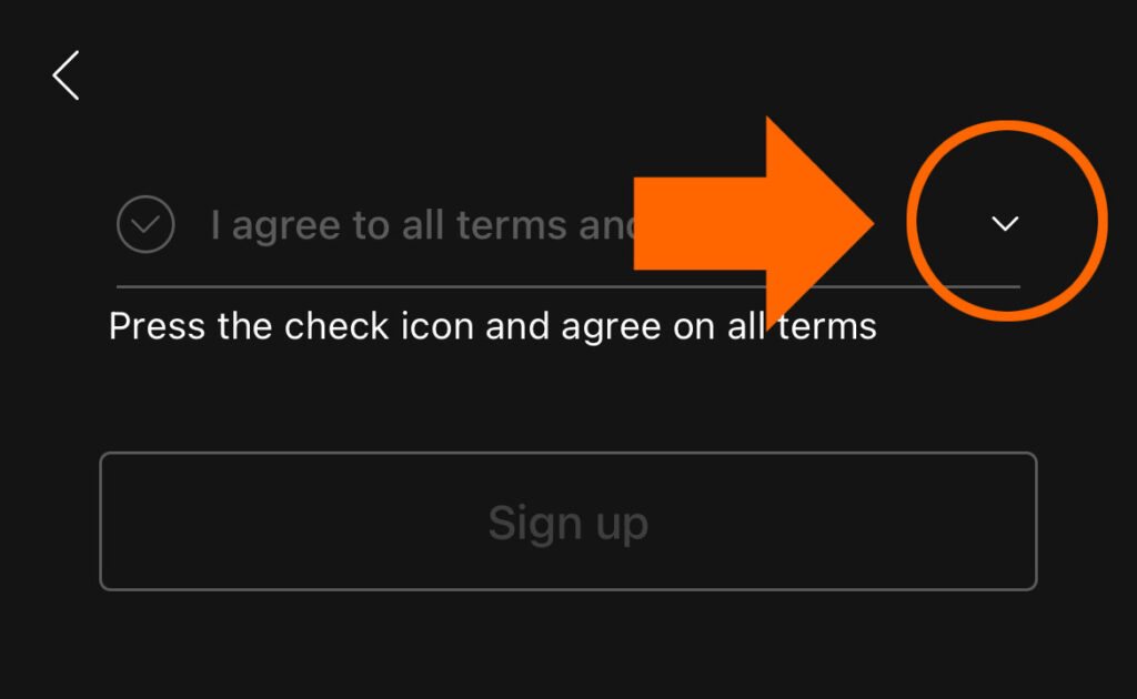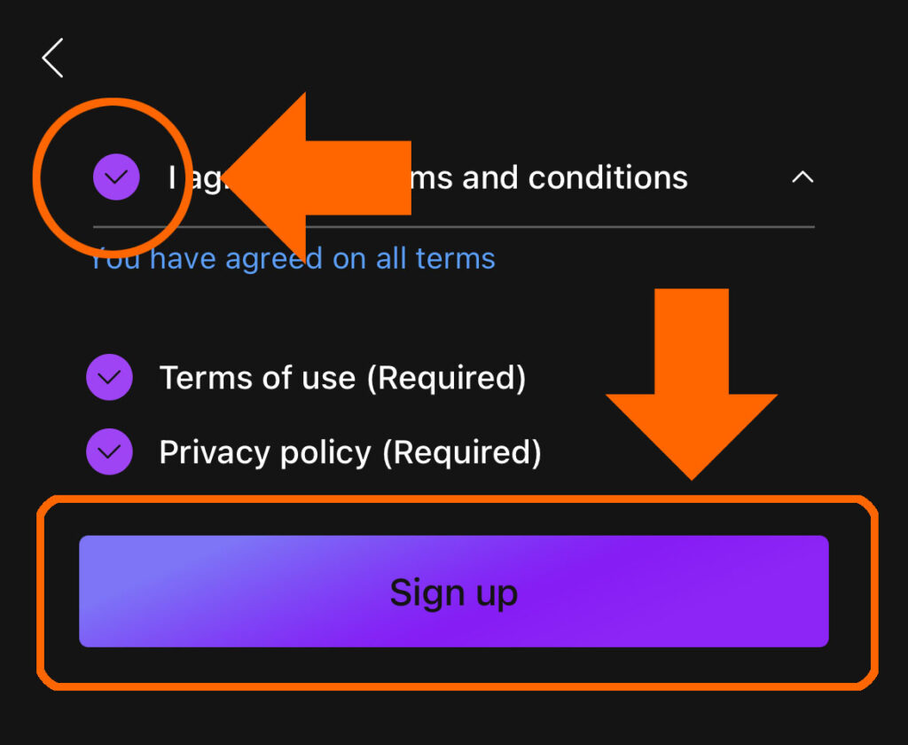 ⑦「利用規約」と「プライバシーポリシー」に同意するために、左の○をタップします。自動的に下の2つもチェクが入ります。